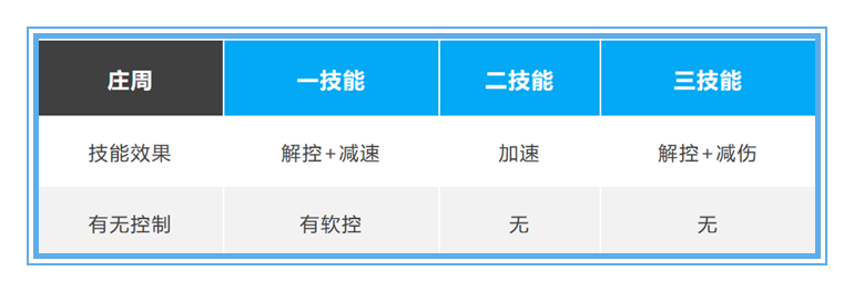 ×ܽ᣺ׯÖÜÓÐÈý¸ö½â¿Ø¼¼ÄÜ£¬ÓÐÁ½¸öÉ˺¦¼õÃ⣬»¹ÓÐÒ»¸ö¼õËÙÒÔ¼°¼ÓËÙЧ¹û¡£
