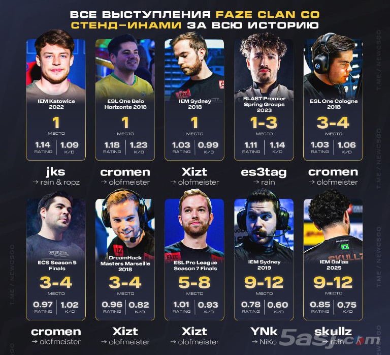 以下为曾经短暂效力过FaZe战队的替补选手取得的战绩与数据统计: