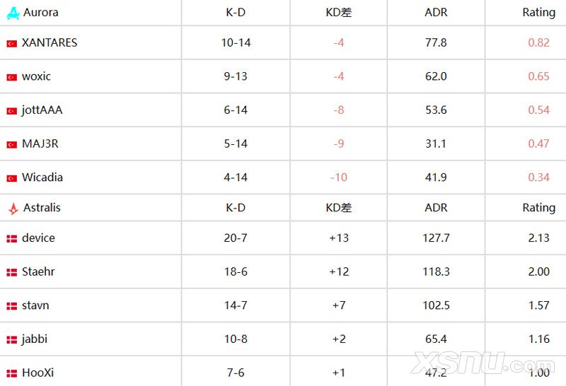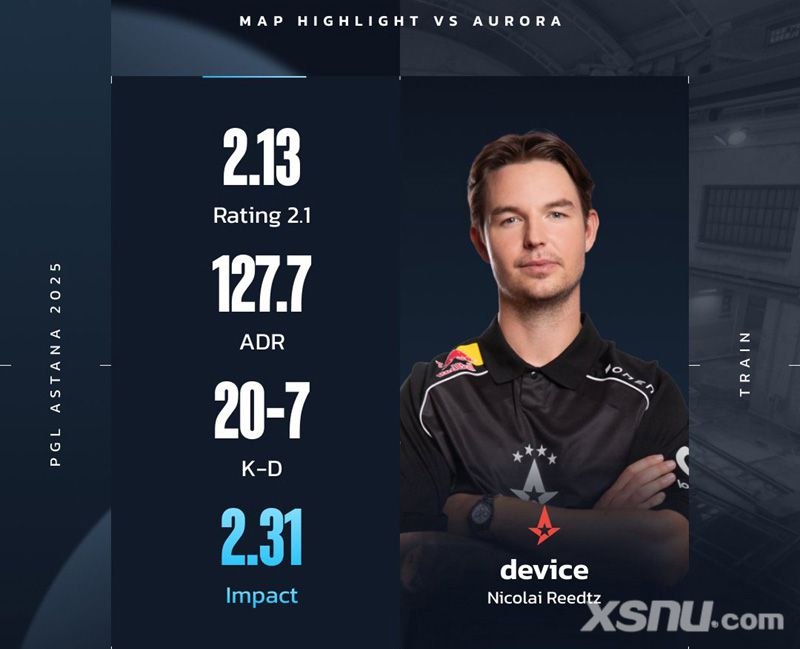 在日前进行的PGL 阿斯塔纳站半决赛中,Astralis战队2-1战胜了Aurora战队。而在图三Train上,Astralis传奇选手device火力全开,他在地图上有着20-7的K/D,127.7的ADR和2.13的rating。